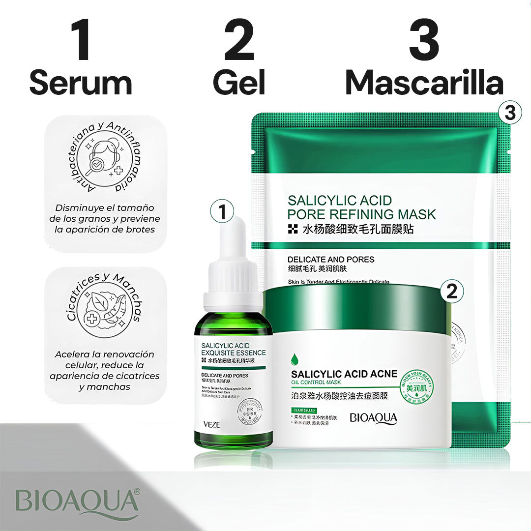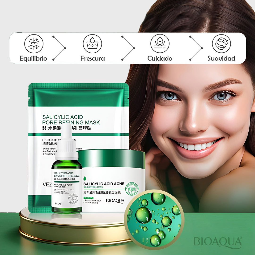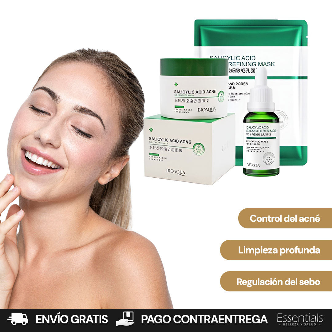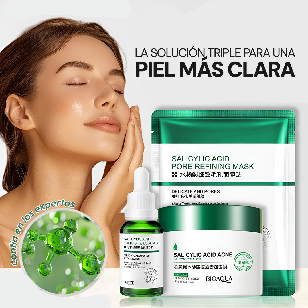 Este combo facial con ácido salicílico controla la grasa, reduce la inflamación y renueva tu piel. Tu piel más limpia, hidratada y uniforme en pocos días