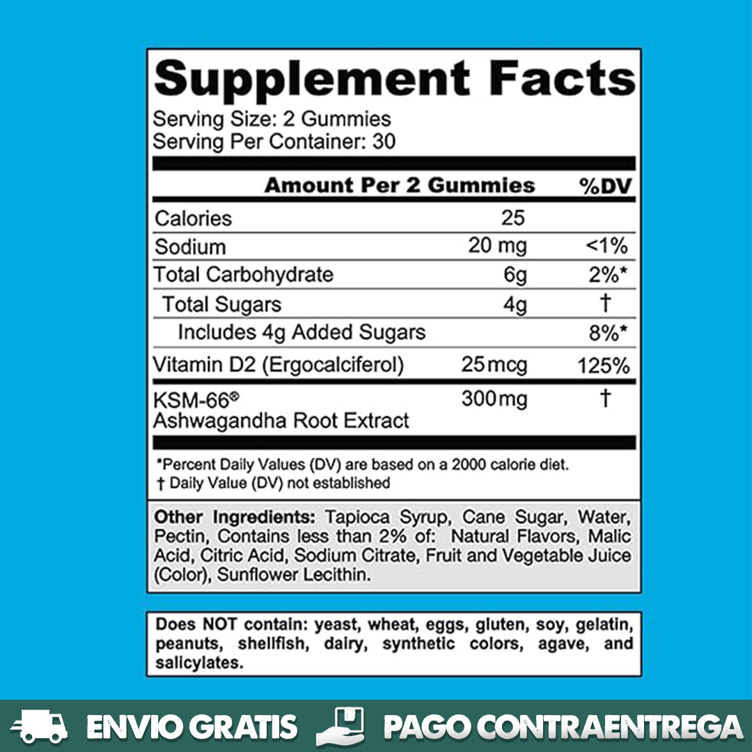 Son gomitas veganas con extracto de ashwagandha KSM-66® y vitamina D2, pensadas para apoyar bienestar, relajación y rutina diaria.