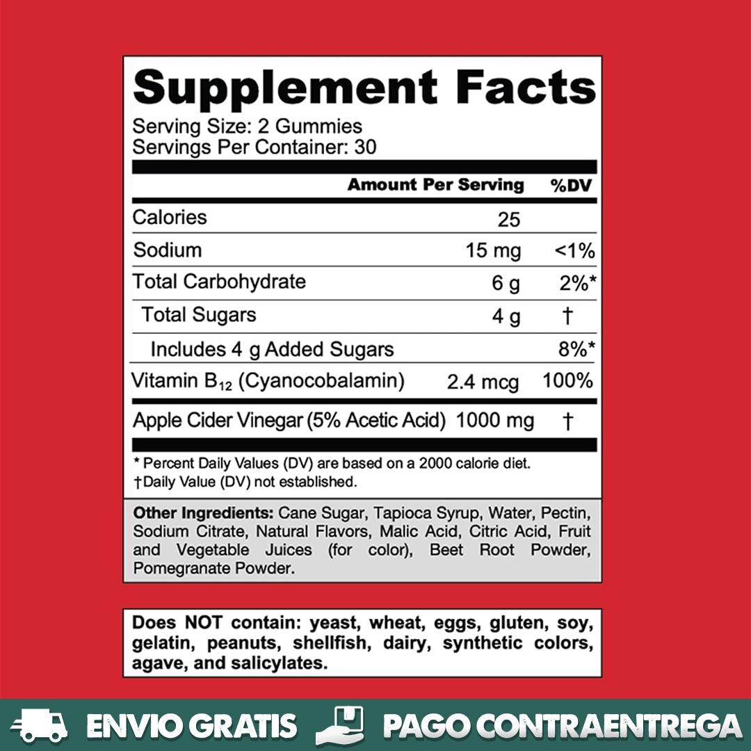 Ingredientes (destacados): vinagre de manzana en polvo, remolacha, granada, pectina, sabores naturales (y azúcares orgánicos)
