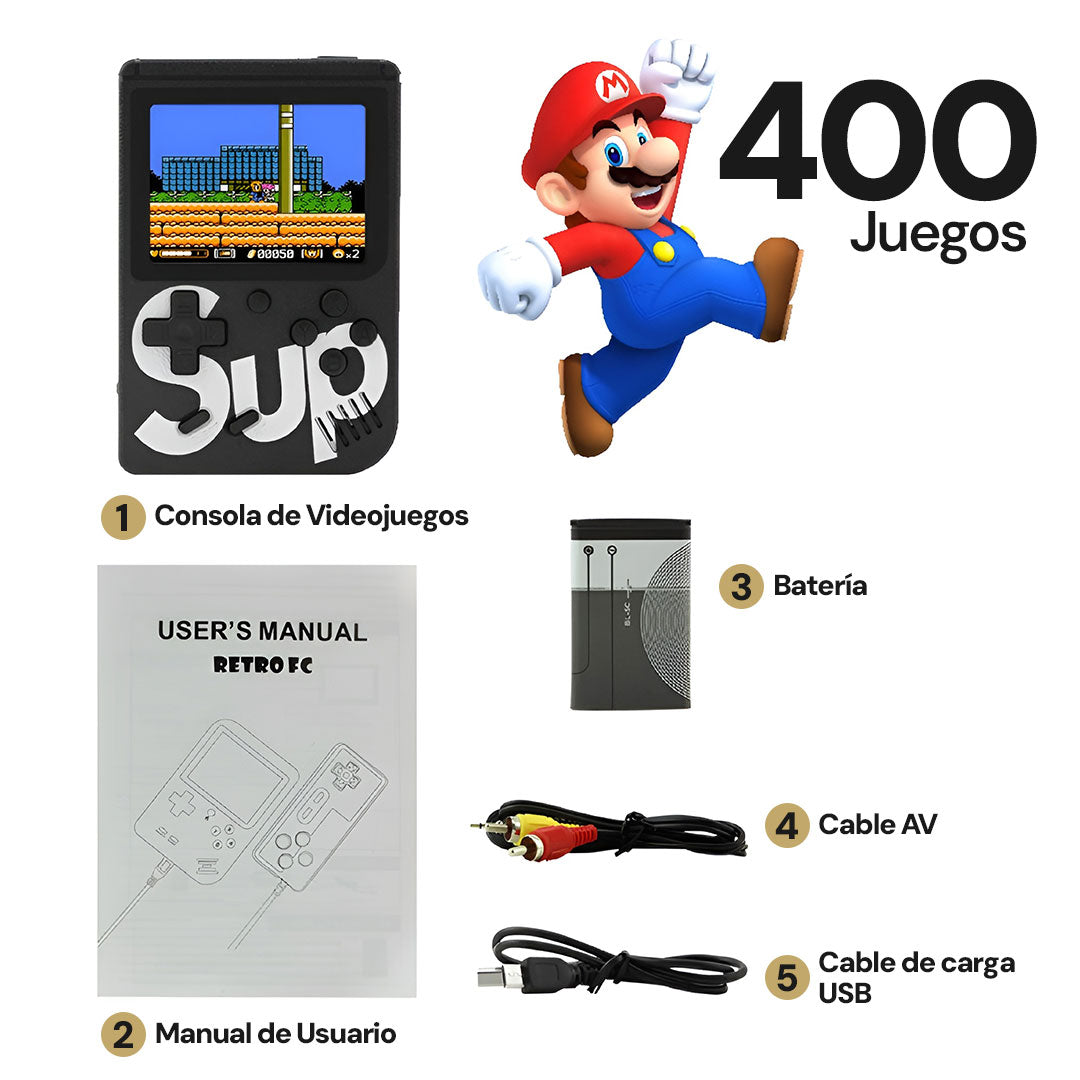 Incluye 400 juegos clásicos, sin repeticiones, como Super Mario, Aladdin, y muchos más.